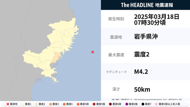 3月18日7時30分頃、岩手県沖を震源とするマグニチュード4.2の地震が観測された。最大震度2を観測したのは、宮城県。