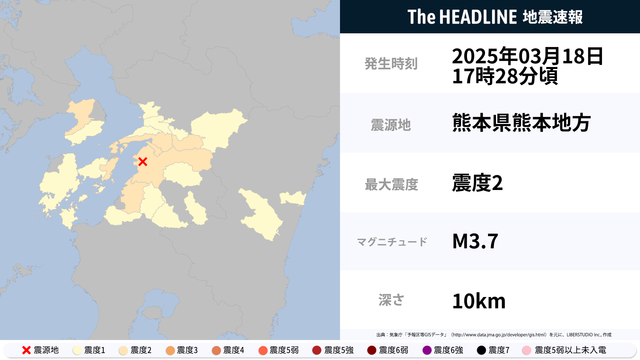 3月18日17時28分頃、熊本県熊本地方を震源とするマグニチュード3.7の地震が観測された。最大震度2を観測したのは、長崎県・熊本県。