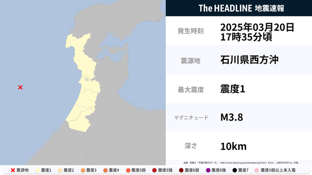 3月20日17時35分頃、石川県西方沖を震源とするマグニチュード3.8の地震が観測された。最大震度1を観測したのは、石川県。