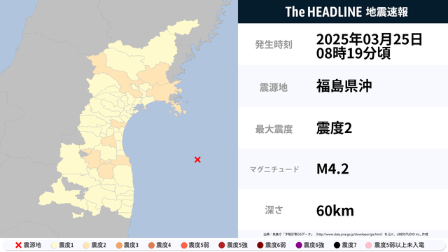 3月25日8時19分頃、福島県沖を震源とするマグニチュード4.2の地震が観測された。最大震度2を観測したのは、宮城県・福島県。