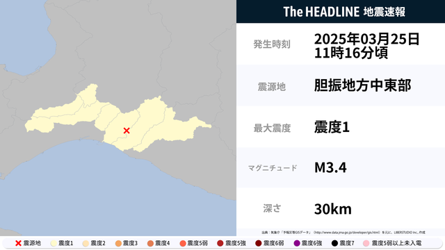 3月25日11時16分頃、胆振地方中東部を震源とするマグニチュード3.4の地震が観測された。最大震度1を観測したのは、北海道。