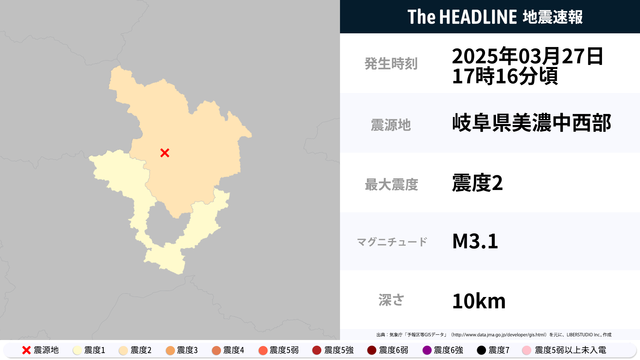 3月27日17時16分頃、岐阜県で最大震度2の地震を観測