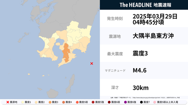 03月29日04時45分頃、大隅半島東方沖を震源とするマグニチュード4.6の地震が観測された。最大震度3を観測したのは、鹿児島県。