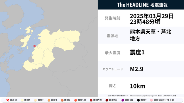 3月29日23時48分頃、熊本県天草・芦北地方を震源とするマグニチュード2.9の地震が観測された。最大震度1を観測したのは、熊本県。