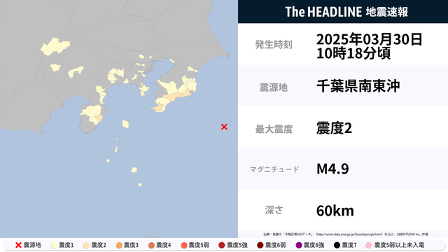 3月30日10時18分頃、千葉県・静岡県で最大震度2の地震を観測