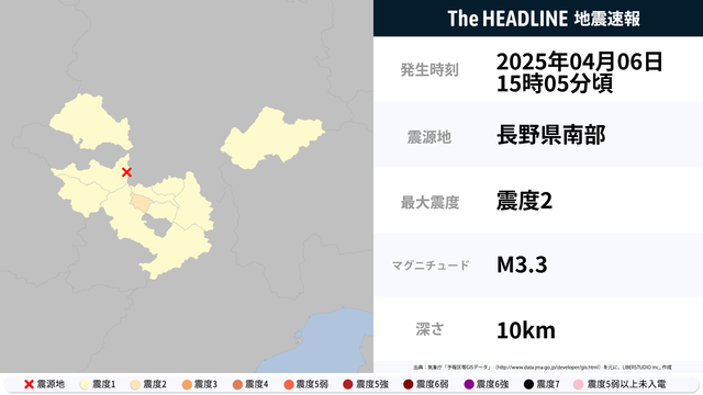 4月6日15時5分頃、長野県南部を震源とするマグニチュード3.3の地震が観測された。最大震度2を観測したのは、長野県。