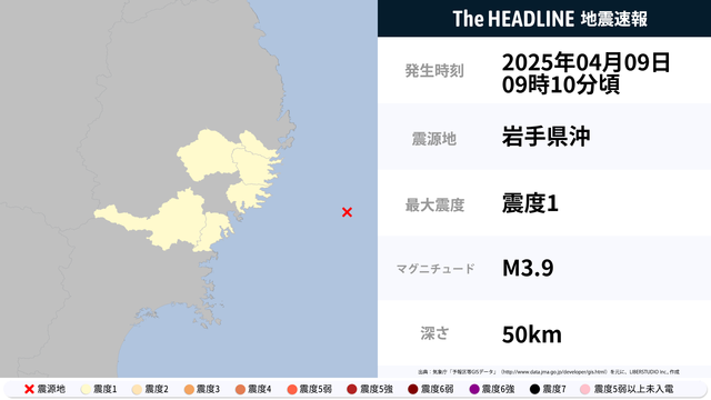 4月9日9時10分頃、岩手県沖を震源とするマグニチュード3.9の地震が観測された。最大震度1を観測したのは、岩手県・宮城県。