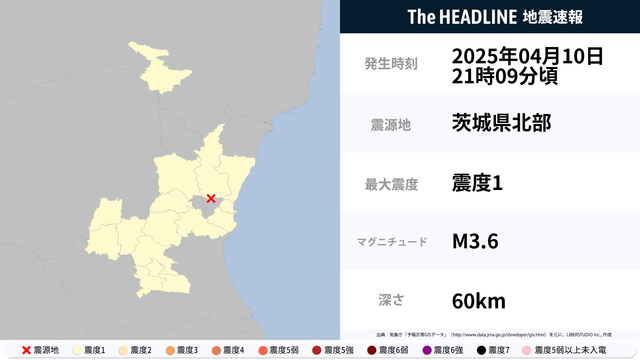 4月10日21時9分頃、茨城県北部を震源とするマグニチュード3.6の地震が観測された。最大震度1を観測したのは、福島県・茨城県など。