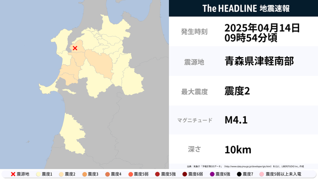 4月14日9時54分頃、青森県津軽南部を震源とするマグニチュード4.1の地震が観測された。最大震度2を観測したのは、青森県・秋田県。