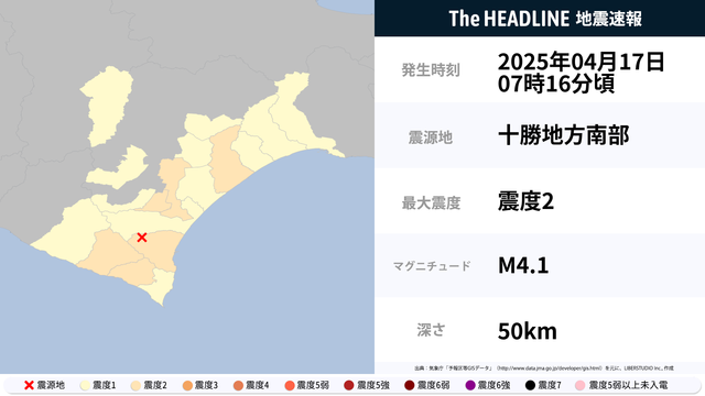 4月17日7時16分頃、十勝地方南部を震源とするマグニチュード4.1の地震が観測された。最大震度2を観測したのは、北海道。
