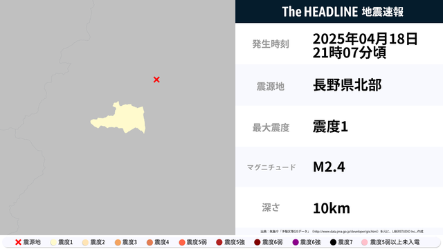 04月18日21時07分頃、長野県北部を震源とするマグニチュード2.4の地震が観測された。最大震度1を観測したのは、長野県。