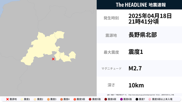 4月18日21時41分頃、長野県北部を震源とするマグニチュード2.7の地震が観測された。最大震度1を観測したのは、長野県。