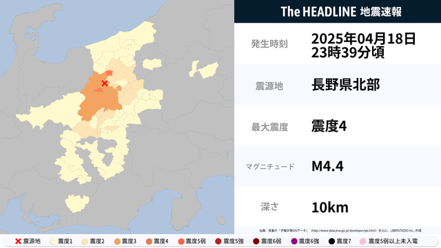 04月18日23時39分頃、長野県北部を震源とするマグニチュード4.4の地震が観測された。最大震度4を観測したのは、長野県。