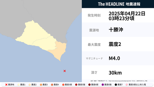 4月22日3時23分頃、十勝沖を震源とするマグニチュード4.0の地震が観測された。最大震度2を観測したのは、北海道。