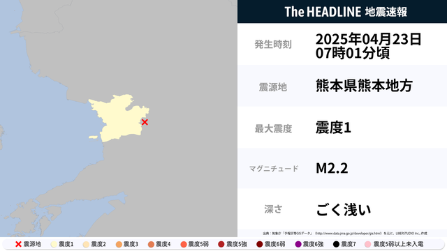 4月23日7時1分頃、熊本県熊本地方を震源とするマグニチュード2.2の地震が観測された。最大震度1を観測したのは、熊本県。