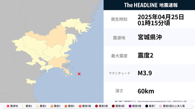 4月25日1時15分頃、宮城県沖を震源とするマグニチュード3.9の地震が観測された。最大震度2を観測したのは、岩手県・宮城県。
