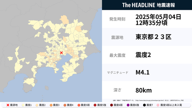5月4日12時35分頃、東京都23区を震源とするマグニチュード4.1の地震が観測された。最大震度2を観測したのは、茨城県・栃木県など。