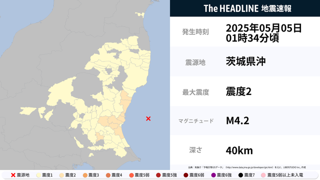 05月05日01時34分頃、茨城県沖を震源とするマグニチュード4.2の地震が観測された。最大震度2を観測したのは、茨城県。