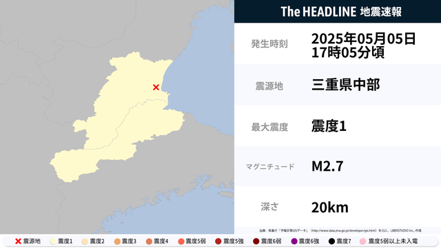 5月5日17時5分頃、三重県中部を震源とするマグニチュード2.7の地震が観測された。最大震度1を観測したのは、三重県。