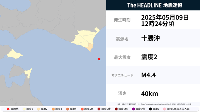 5月9日12時24分頃、十勝沖を震源とするマグニチュード4.4の地震が観測された。最大震度2を観測したのは、北海道。