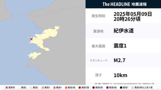 5月9日20時26分頃、紀伊水道を震源とするマグニチュード2.7の地震が観測された。最大震度1を観測したのは、和歌山県。