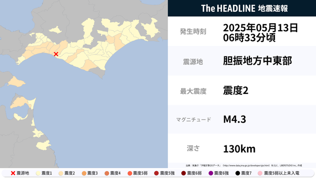 5月13日6時33分頃、胆振地方中東部を震源とするマグニチュード4.3の地震が観測された。最大震度2を観測したのは、北海道・青森県。