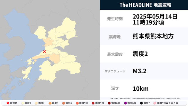5月14日11時19分頃、熊本県熊本地方を震源とするマグニチュード3.2の地震が観測された。最大震度2を観測したのは、熊本県。