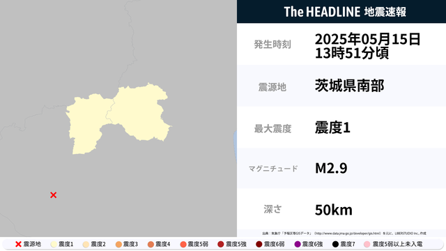 5月15日13時51分頃、茨城県で最大震度1の地震を観測