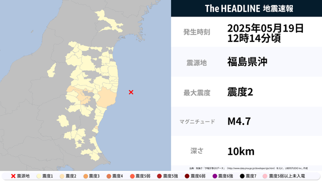 05月19日12時14分頃、福島県沖を震源とするマグニチュード4.7の地震が観測された。最大震度2を観測したのは、福島県・茨城県。