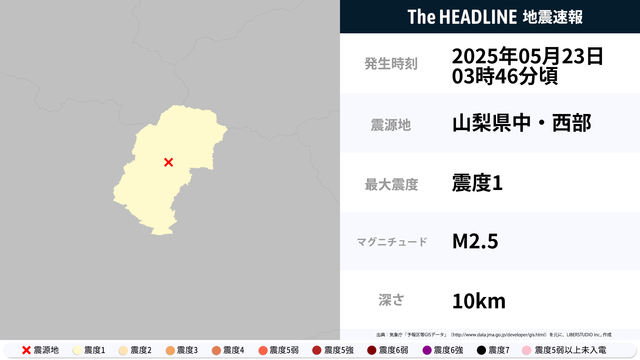 5月23日3時46分頃、山梨県で最大震度1の地震を観測
