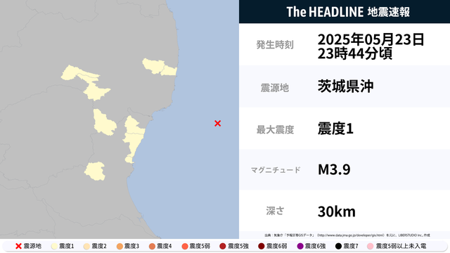 5月23日23時44分頃、茨城県沖を震源とするマグニチュード3.9の地震が観測された。最大震度1を観測したのは、福島県・茨城県。