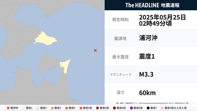 5月25日2時49分頃、浦河沖を震源とするマグニチュード3.3の地震が観測された。最大震度1を観測したのは、北海道・青森県。