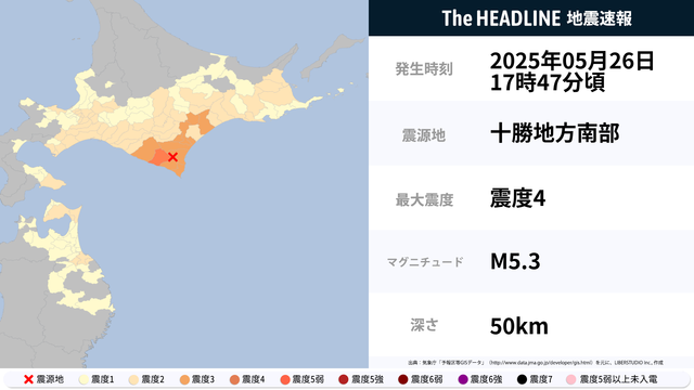 5月26日17時47分頃、十勝地方南部を震源とするマグニチュード5.3の地震が観測された。最大震度4を観測したのは、北海道。