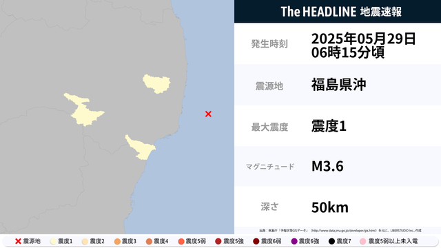 5月29日6時15分頃、福島県沖を震源とするマグニチュード3.6の地震が観測された。最大震度1を観測したのは、福島県・茨城県。