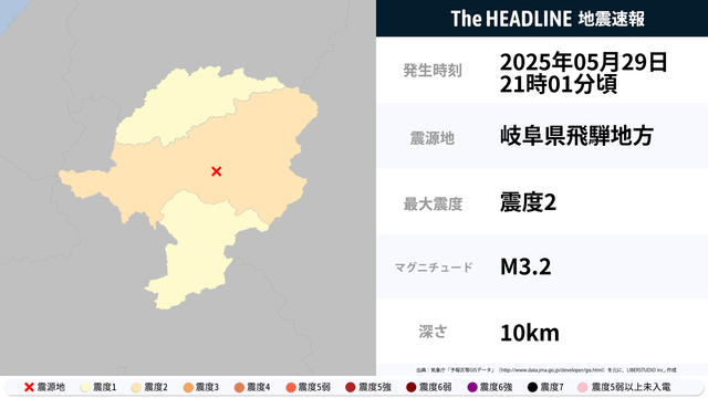 5月29日21時1分頃、岐阜県で最大震度2の地震を観測