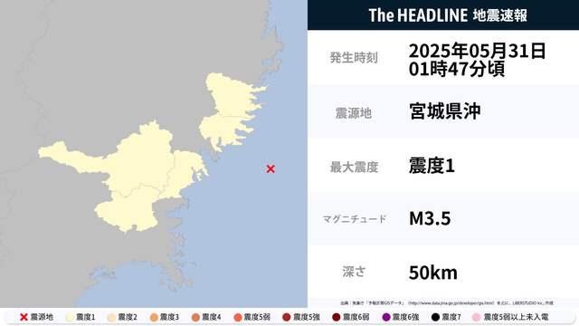 05月31日01時47分頃、宮城県沖を震源とするマグニチュード3.5の地震が観測された。最大震度1を観測したのは、岩手県・宮城県。