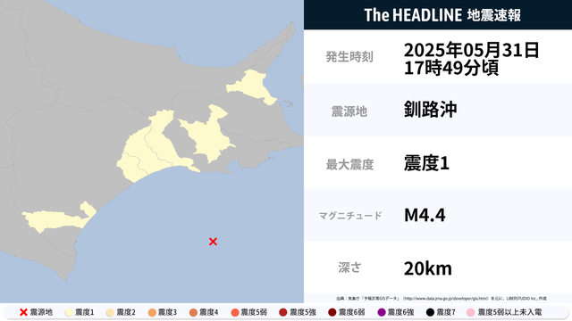 5月31日17時49分頃、釧路沖を震源とするマグニチュード4.4の地震が観測された。最大震度1を観測したのは、北海道。