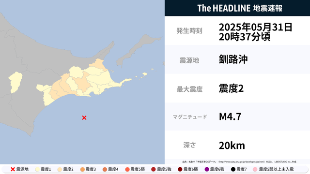 5月31日20時37分頃、北海道で最大震度2の地震を観測