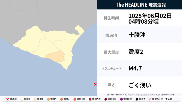 6月2日4時8分頃、十勝沖を震源とするマグニチュード4.7の地震が観測された。最大震度2を観測したのは、北海道。