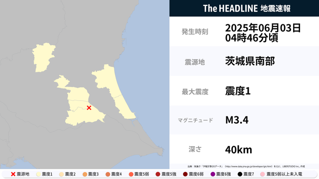 06月03日04時46分頃、茨城県南部を震源とするマグニチュード3.4の地震が観測された。最大震度1を観測したのは、茨城県。