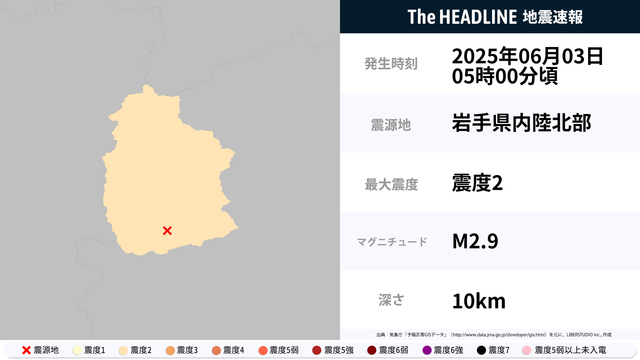 6月3日5時0分頃、岩手県内陸北部を震源とするマグニチュード2.9の地震が観測された。最大震度2を観測したのは、岩手県。