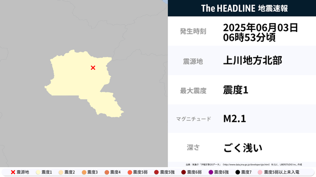 6月3日6時53分頃、上川地方北部を震源とするマグニチュード2.1の地震が観測された。最大震度1を観測したのは、北海道。