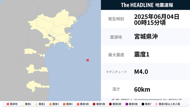6月4日0時15分頃、宮城県沖を震源とするマグニチュード4.0の地震が観測された。最大震度1を観測したのは、岩手県・宮城県など。