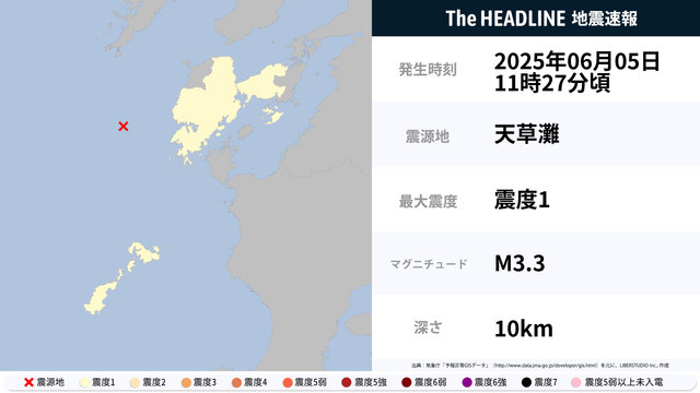 6月5日11時27分頃、天草灘を震源とするマグニチュード3.3の地震が観測された。最大震度1を観測したのは、熊本県・鹿児島県。