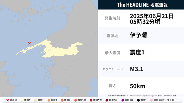 6月21日5時32分頃、愛媛県で最大震度1の地震を観測