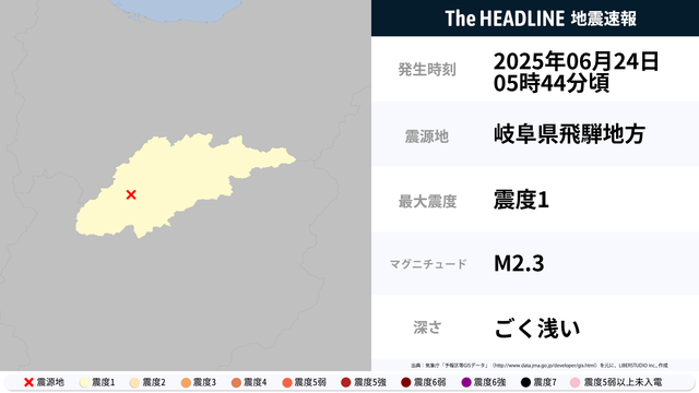 6月24日5時44分頃、岐阜県で最大震度1の地震を観測