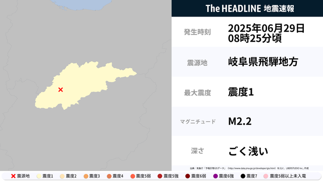 6月29日8時25分頃、岐阜県飛騨地方を震源とするマグニチュード2.2の地震が観測された。最大震度1を観測したのは、岐阜県。