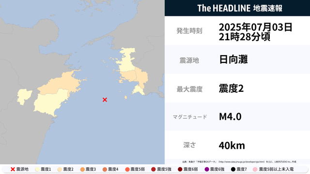 07月03日21時28分頃、日向灘を震源とするマグニチュード4.0の地震が観測された。最大震度2を観測したのは、愛媛県・高知県など。