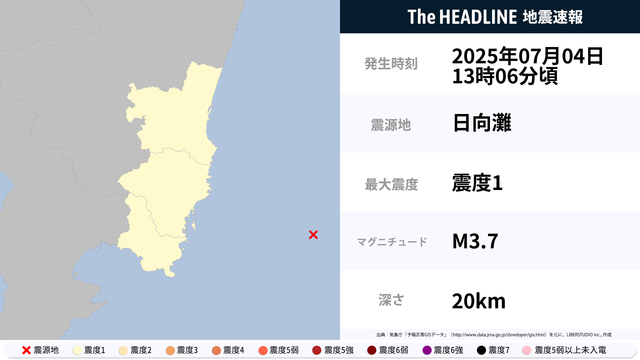 07月04日13時06分頃、日向灘を震源とするマグニチュード3.7の地震が観測された。最大震度1を観測したのは、宮崎県。