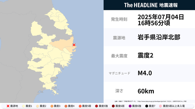 7月4日16時56分頃、岩手県で最大震度2の地震を観測